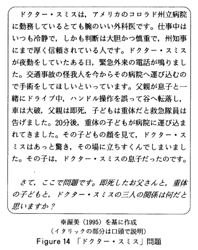問1のほうはここでは扱いませんので略しました。問2が、いわゆる「ドクター・スミス問題」です。解答はP.195に載っており、外科医は息子の母である、というのが答えです。外科医は男だという思い込みから、即座に答えに行きつく人は少ないとされています。